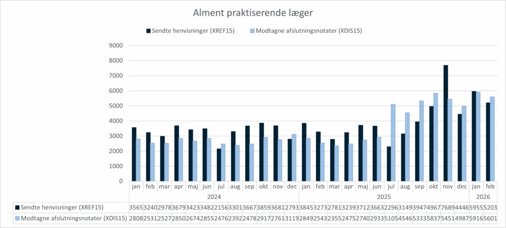 - Forholdet mellem antal sendte henvisninger (XREF15) og antal sendte afslutningsnotater (XDIS15) for hhv. alment praktiserende læger og regionerne.