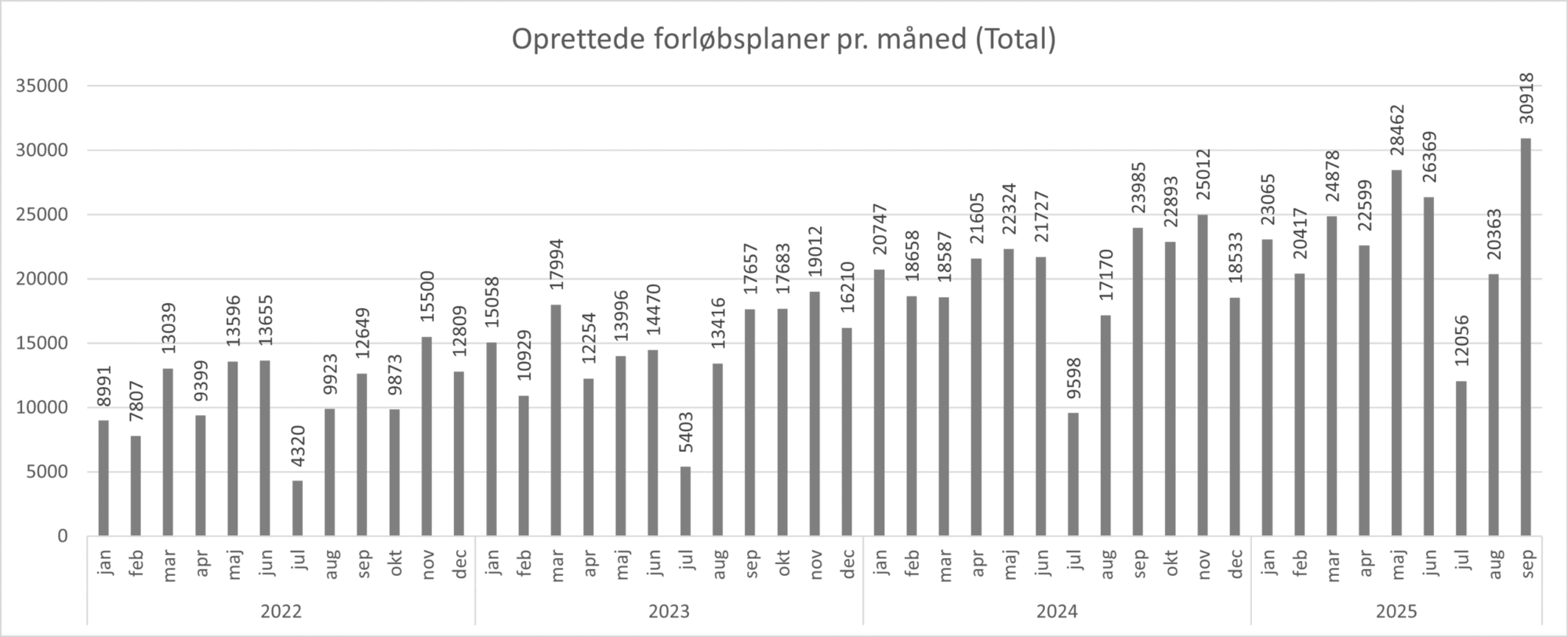 - Første graf viser hvor mange forløbsplaner, der er oprettet i de enkelte måneder fra januar 2021 til juni 2025.