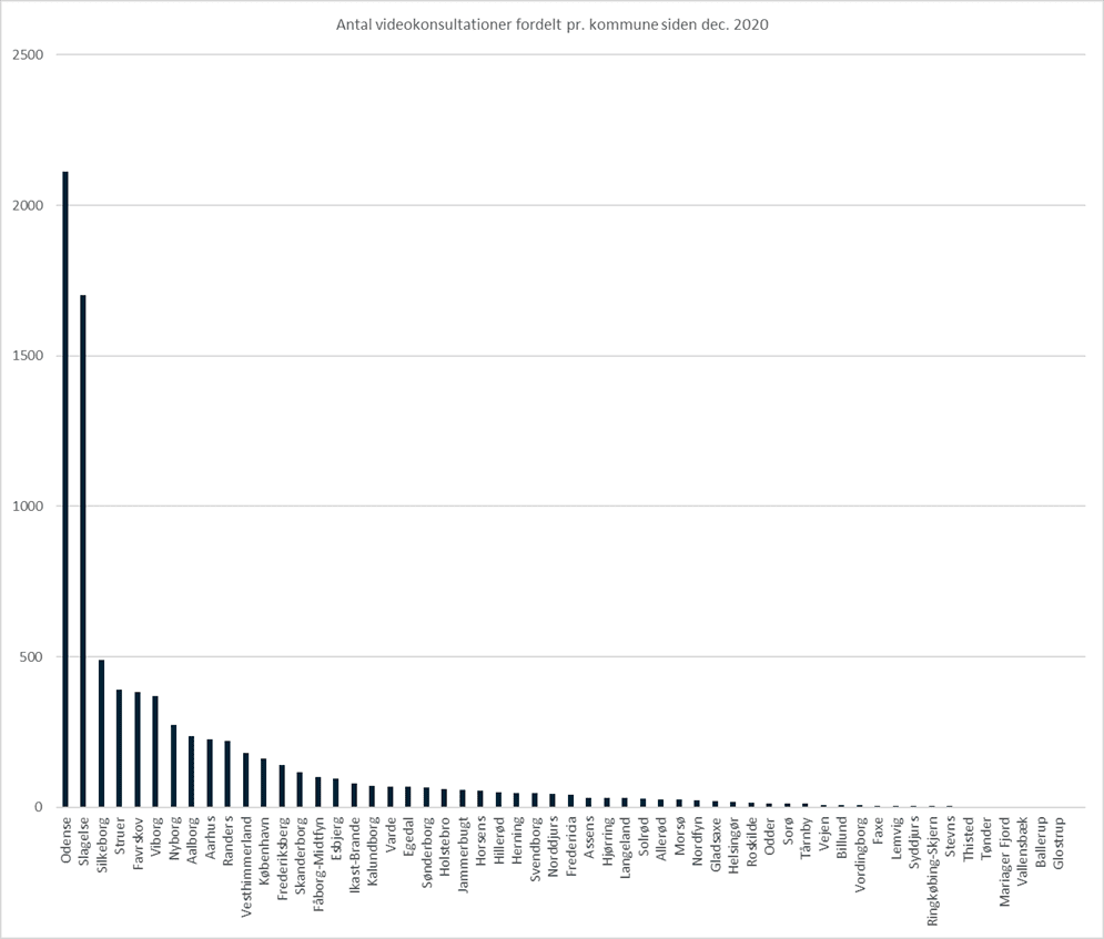 Nedenstående diagram viser antal videokonsultationer foretaget via Kontakt Læge-appen fordelt pr. kommune i perioden 1. december 2020 – 30. september 2025. Kommuner, som ikke fremgår, er udtryk for, at kommunen ikke har foretaget videokonsultation(er) via appen.