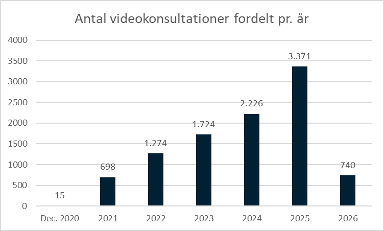 Nedenstående diagram viser kommunernes samlede antal videokonsultationer via Kontakt Læge-appen fordelt pr. år. Søjlen 2020 indeholder december måned. Søjlen 2024 indeholder data fra 1. januar – 28. februar 2026.