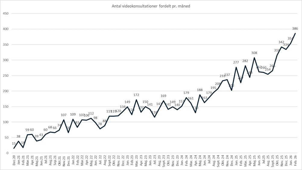 Nedenstående graf viser det samlede antal videokonsultationer via Kontakt Læge-appen for alle igangværende kommuner fordelt pr. måned.