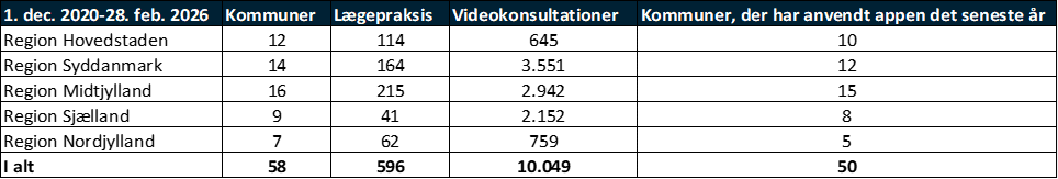 Nedenstående tabel viser antal kommuner og lægepraksis, som har anvendt Kontakt Læge-appen mere end 2 gange fordelt pr. region i perioden 1. december 2020 – 28. februar 2026. Testkald ikke medtaget.