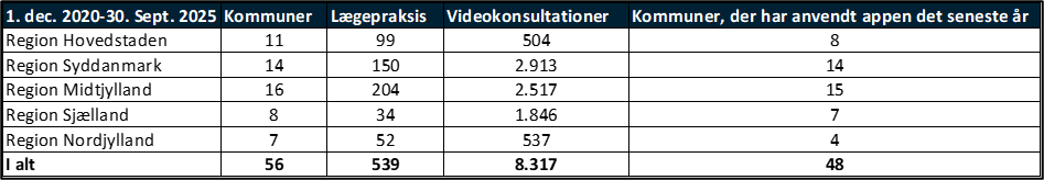 Nedenstående tabel viser antal kommuner og lægepraksis, som har anvendt Kontakt Læge-appen mere end 2 gange fordelt pr. region i perioden 1. december 2020 – 30. september 2025. Testkald ikke medtaget.