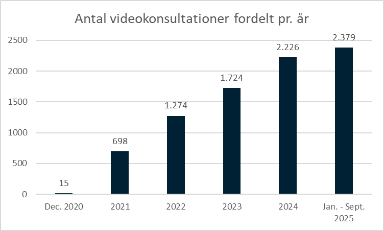Nedenstående diagram viser kommunernes samlede antal videokonsultationer via Kontakt Læge-appen fordelt pr. år. Søjlen 2020 indeholder december måned. Søjlen 2024 indeholder data fra 1. januar – 30. september 2025.