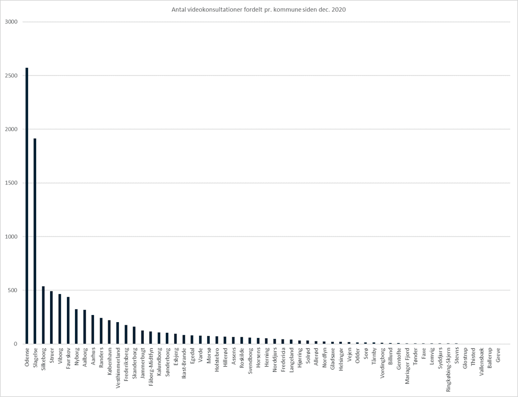 Nedenstående diagram viser antal videokonsultationer foretaget via Kontakt Læge-appen fordelt pr. kommune i perioden 1. december 2020 – 30. november 2025. Kommuner, som ikke fremgår, er udtryk for, at kommunen ikke har foretaget videokonsultation(er) via appen.