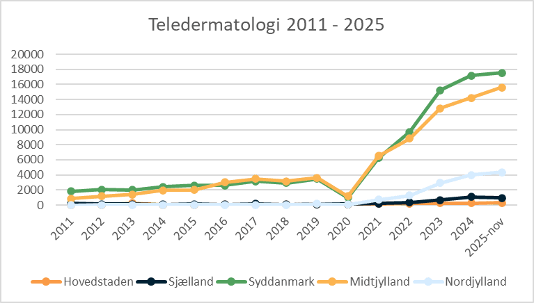 - Graf, der viser udviklingen i sendte bilag fra almen læge til speciallæge fra 2011-2025, fordelt på regioner