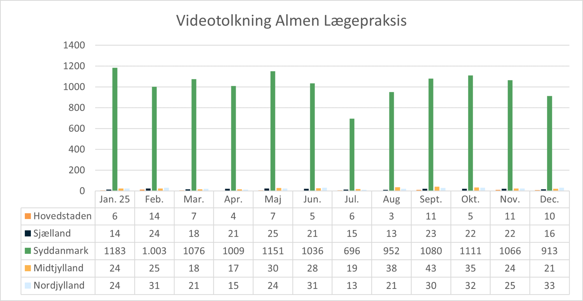 Der er i alt gennemført 13.221 videotolkninger i almen lægepraksis i perioden januar 2025 til december 2025, hvilket samlet svarer til, at 13 pct. af alle tolkninger i de 5 regioner er gennemført som videotolkninger i almen praksis.