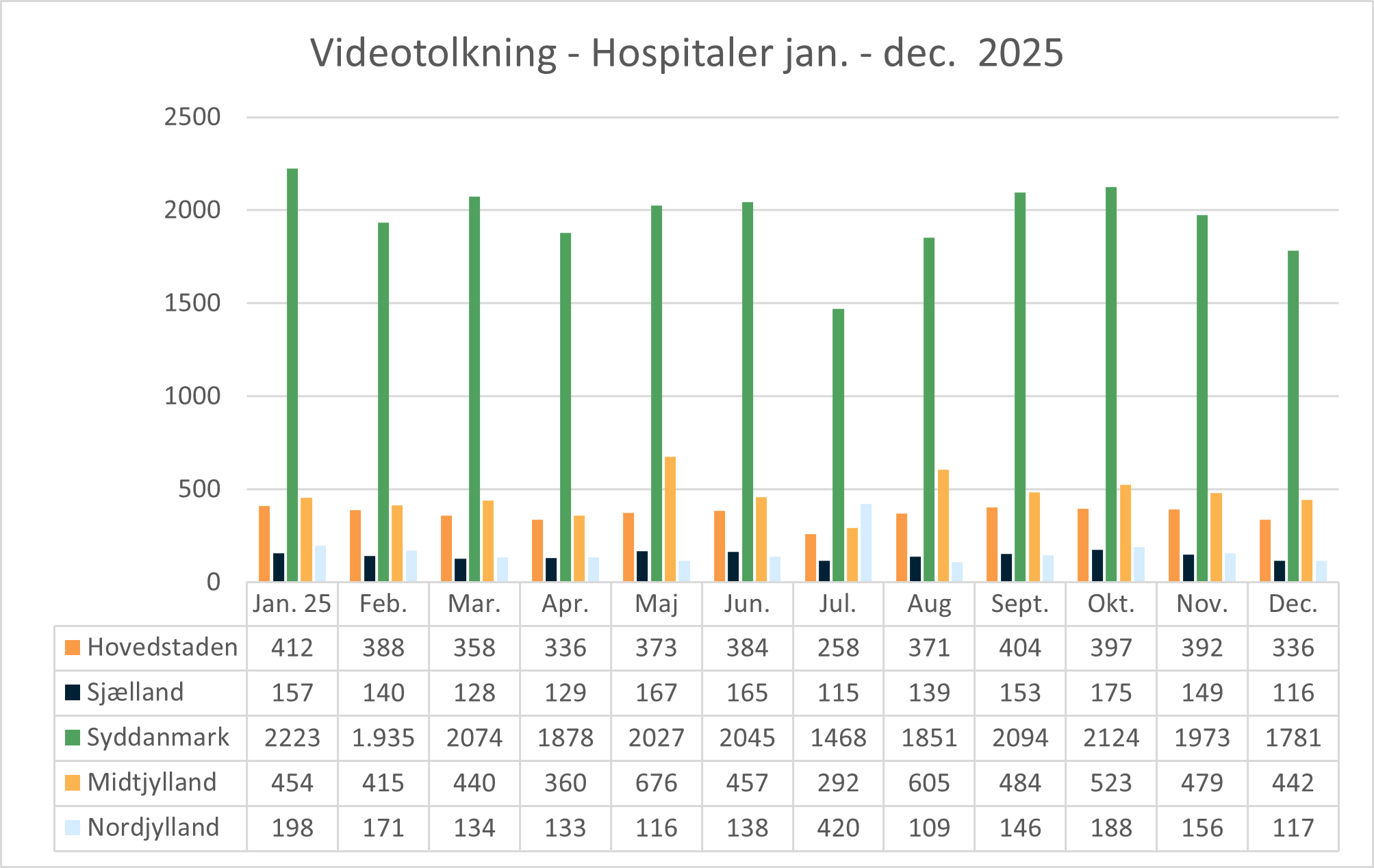 Der er i alt gennemført 37.268 videotolkninger på hospitalerne i perioden januar 2025 til december 2025, hvilket samlet svarer til, at 32 pct. af alle tolkninger på sygehusene i de 5 regioner er gennemført som videotolkninger.